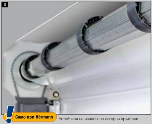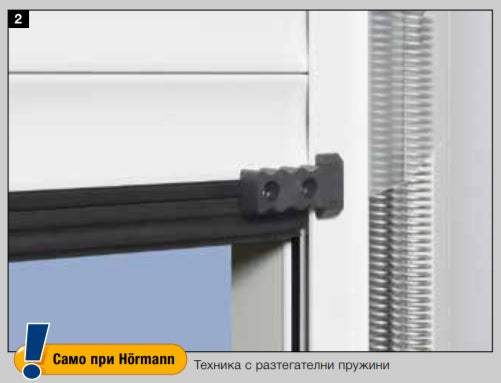Ролетните врати на Hörmann RollMatic с двойни разтегателни пружини и двойни стоманени въжета обезопасяват платното срещу падане във всяка позиция на вратата. Патентованата система „пружина в пружина“ и прозрачната защитна облицовка предотвратяват вероятността при скъсване на някоя от пружините тя да отскочи встрани и да нарани някого.
